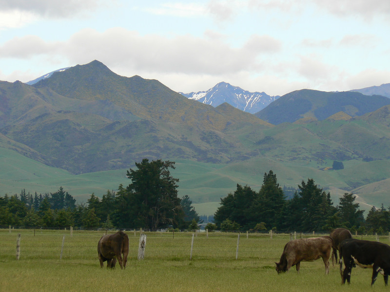 Livestock, mainly cows but sometimes deer, provide a foreground for the a peep of the Alps in the distance. Skiers come to Mt Lyford in the winter.